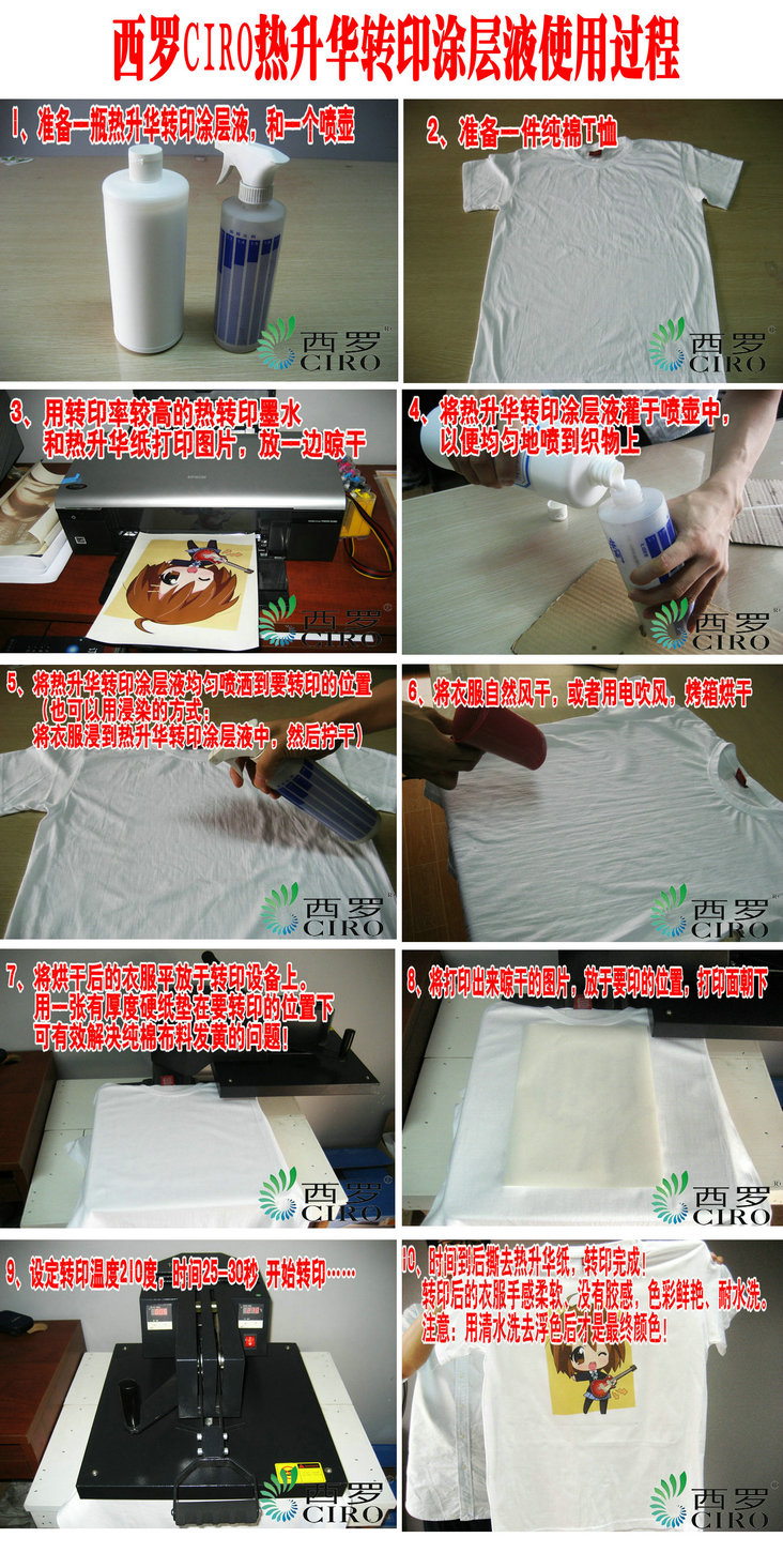 使用方法简单,可以用喷涂方式:采用喷壶或喷枪,均匀喷涂适量的棉类热升华转印涂层液到要加工的纯棉成衣/裁片所需要上图案的位置上,干燥后即可进行热升华转印加工;也可以用浸染方式:将纯棉布匹/成衣/裁片完全浸染于棉类热升华转印涂层液中,待完全浸染后,即可将纯棉布匹/成衣/裁片取出拧干/或用脱水机脱水,然后烘干后即可进行热升华转印加工。